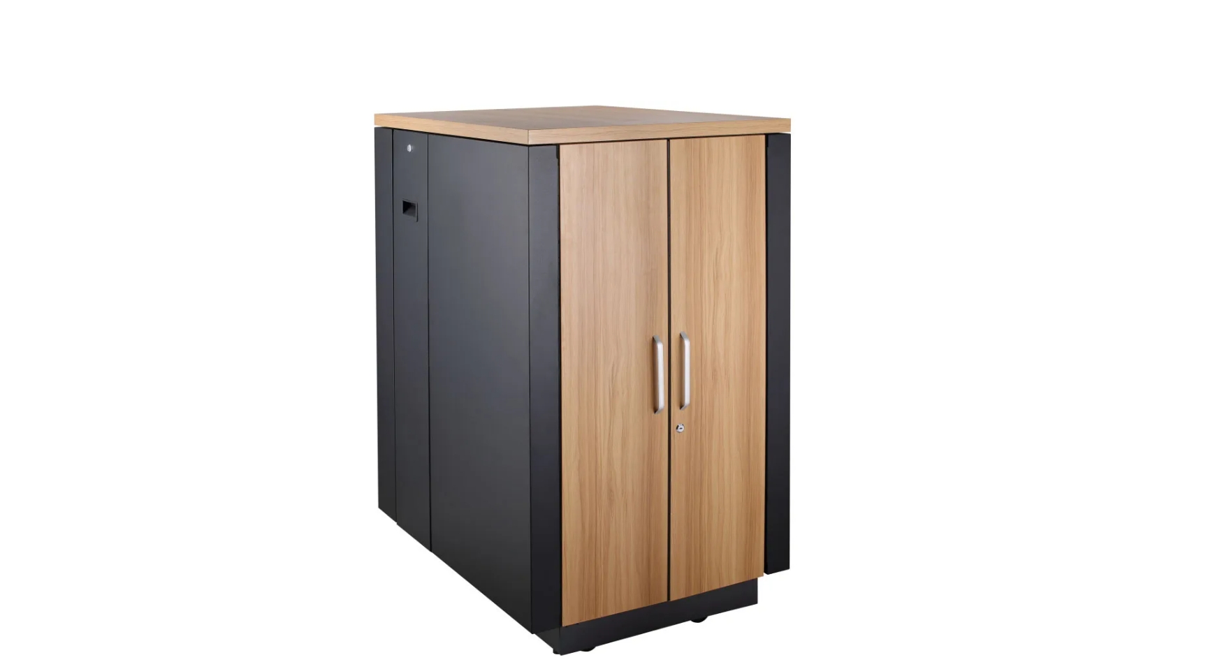 Constructed from premium cold-rolled steel with reinforced welded frame design, the rack offers a heavy-duty load capacity up to 1000kg. The exterior features a modern black finish with wood-tone front panel and top cover, allowing the cabinet to blend seamlessly into office interiors.